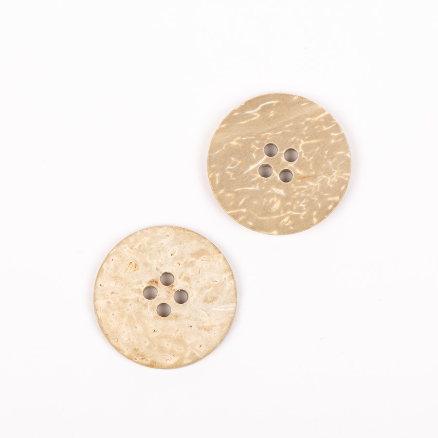 Knapper af skal fra kokosnød er ikke kun holdbare men også miljøvenlige. Fremstillet af blegede skaller fra kokosnød – et naturmateriale. Hver knap har små variationer i farve og tekstur og kan bruges fra begge sider for at opnå forskelligt udseende.