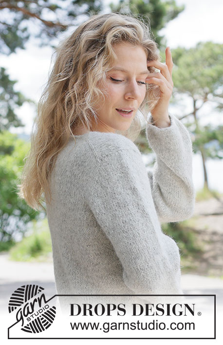 Strikket bluse i DROPS Brushed Alpaca Silk og DROPS Alpaca. Arbejdet strikkes oppefra og ned i glatstrik med europæisk bærestykke, v-hals og i-cord. Størrelse XS – XXXL.